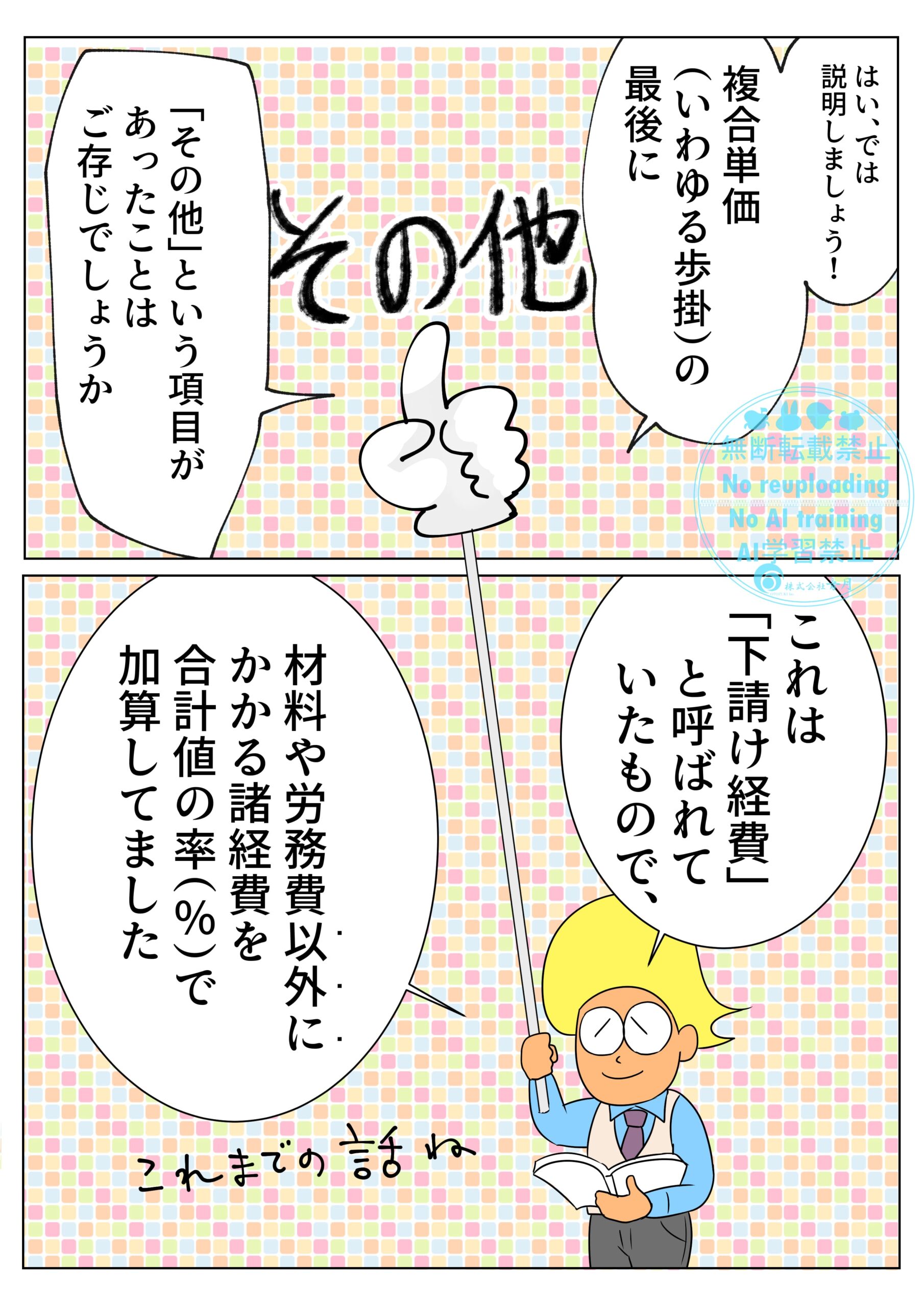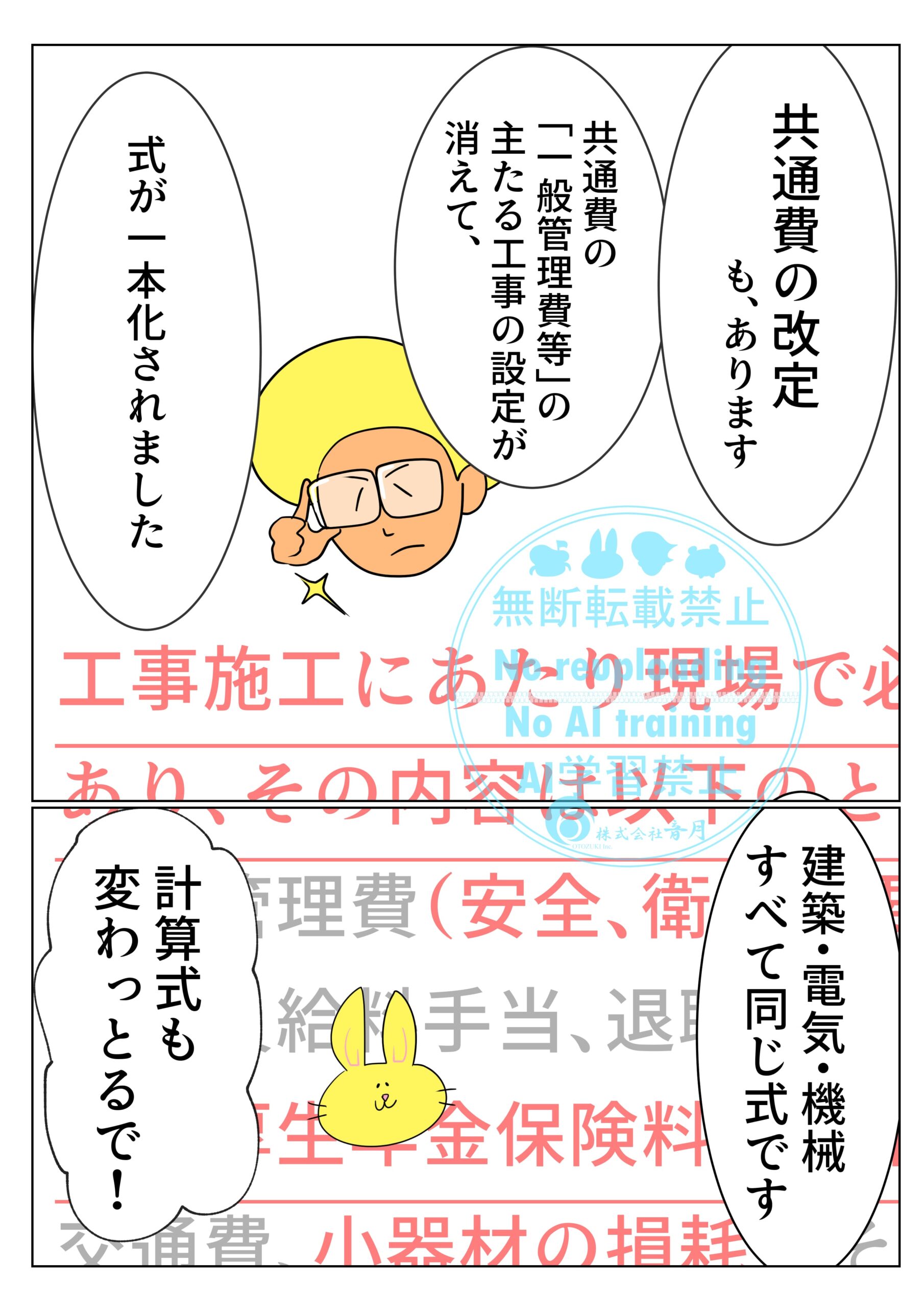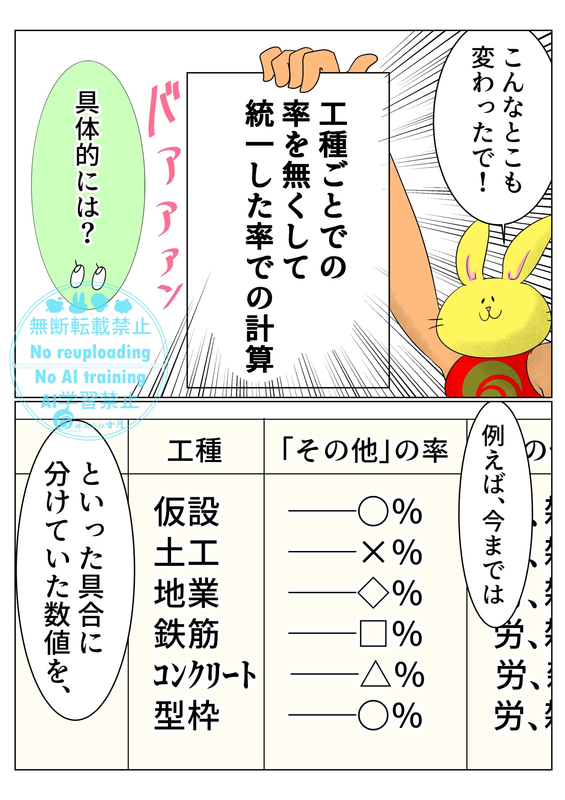 その他が消えて諸経費に。工種ごとの率ではなく労務費かそれ以外か。一般管理費等の主たる工事の設定が消えて……各方面に影響アリやね。